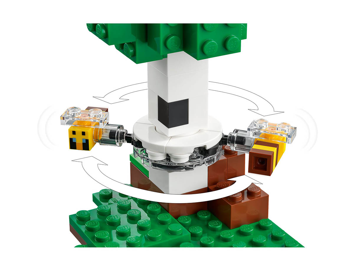 Mit dem LEGO® Minecraft® Das Bienenhäuschen kannst du Honigwaben aus dem Bienenstock ernten, Feldfrüchte auf der Farm anbauen und feindselige Kreaturen verscheuchen. Ob du dich alleine oder mit Freunden auf Abenteuerreise begibst, bleibt ganz dir überlassen. Das Set beinhaltet einen spielbaren Charakter in Form eines Honigbären sowie drei freundliche Bienen und eine zornige Biene.